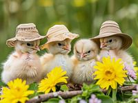 Grappige kuikens met zonnehoed - Een grappige muurschildering als decoratieve kunst voor een stijlvol interieur.