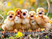Vijf luidruchtige kuikens - Een humoristische en grappige muurschildering als decoratieve kunst voor een stijlvol interieur.