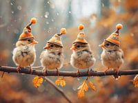 Vier mussenbroers en -zussen met warme puntmutsen in de herfst. Een humoristische en grappige muurschildering als decoratieve kunst voor een stijlvol interieur.