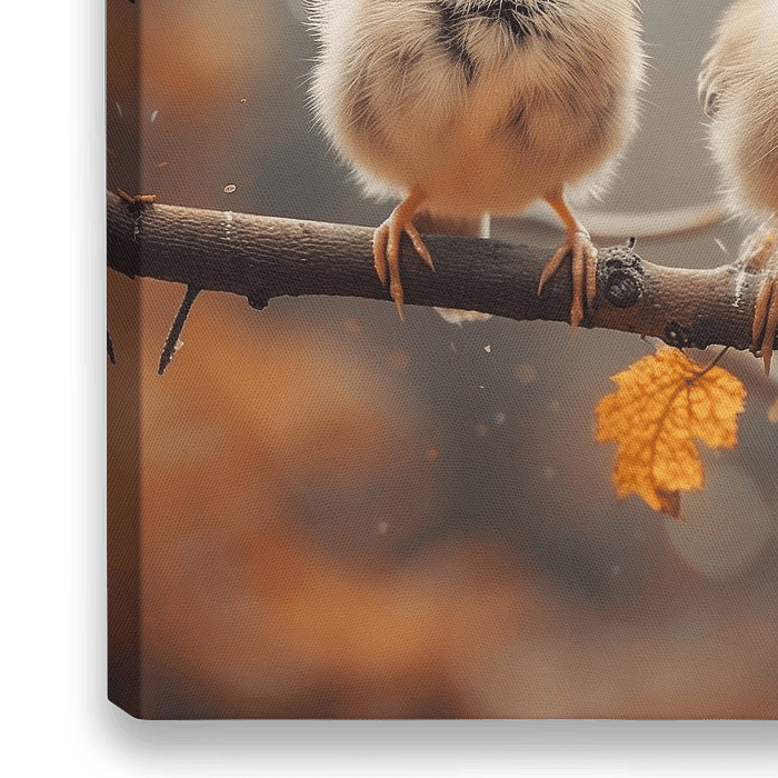 Vier mussenbroers en -zussen met warme puntmutsen in de herfst. Een humoristische en grappige muurschildering als decoratieve kunst voor een stijlvol interieur.