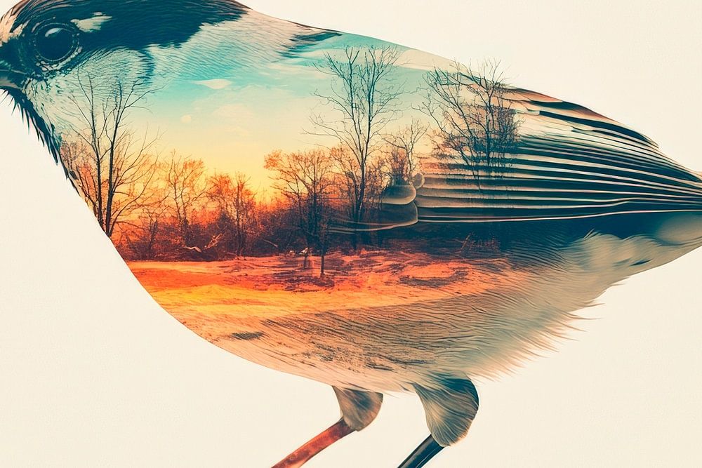 Een betoverend samenspel van natuur en wilde dieren: een vogel die de zachte kleuren van een zonsondergang in zijn verenkleed draagt. De glinsterende landschapsvormen roepen een gevoel van vrijheid en rust op. Ideaal voor de woonkamer, waar het de zintuigen stimuleert en een harmonieuze sfeer creëert.