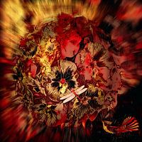 Vogel kijkt naar de bloemenexplosie, is een bloemen bol van Vlambloemen die lijkt te exploderen. De exotische vogel kijkt naar deze explosie, of misschien wel naar de libelle die de bloem bezoekt. Het is een kleurrijk geheel met de kleuren rood en (goud) geel in vele tinten. De kleuren zijn warm en vrolijk en er is veel te zien op dit…