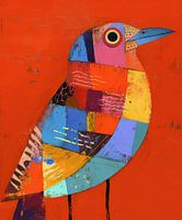 Vogel met Kleur | Vogel met Kleurvlakken - Dit is een kleurrijk schilderij van een vogel met een opvallend ronde vorm en verschillende kleurvlakken, dat tegen een felle oranje achtergrond is geplaatst.