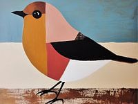 Vogel met Kleuren - Op dit vogel schilderij zie je een schattige vogel met een kleurrijke uitstraling, met een grote felle oranje en bruine borst, een zwarte vleugel en een zachte achtergrond in pastelkleuren.