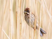 Deze prachtige vogel, een rietgors, was eten aan het verzamelen voor haar jongen. De combinatie van het zacht kleurige riet het mooie bruine van het vogeltje vond ik erg mooi. Ik blijf altijd op afstand zodat de dieren niet gestoord worden.