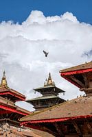 Een duif ontsnapt tussen de boeddhistische tempels en vliegt de wolken in. Durbar square tempels in Kathmandu, Nepal.