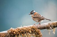Deze gedetailleerde natuurfoto toont een kleine vogel zittend op een met mos begroeide tak, tegen een zachte blauwgroene achtergrond die het onderwerp prachtig laat uitkomen. De subtiele verenstructuur en warme bruine en oranje tinten van het verenkleed komen scherp naar voren. Dit verstilde moment straalt rust, precisie en natuurlijke elegantie uit, perfect voor liefhebbers van vogelobservatie, macrofotografie en serene composities uit het dierenrijk.