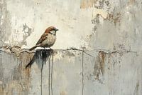 Vogel op Muur | Vogel en Aardetinten Muur - Dit is een schilderij van een vogel die op een muur zit, met een opvallende combinatie van aardetinten en grijs die een moderne uitstraling geven aan het kunstwerk.