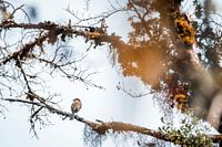 Deze dromerige natuurfoto toont een klein vogeltje dat eenzame rust vindt op een met mos begroeide tak, omringd door een diffuus spel van licht en schaduw. Het zachte contrast tussen de fijne lijnen van de kale boomtakken en de open, lichte achtergrond creëert een minimalistische sfeer vol stilte en concentratie. De subtiele tinten van…