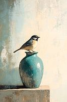 Een verfijnde en serene compositie van een vogel die rustig op de rand van een blauwe vaas zit. Dit kunstwerk combineert natuurlijke elegantie met minimalistisch design en een subtiele textuur. Perfect voor een rustige sfeer in je interieur, geschikt voor zowel slaapkamers als eetkamers.
