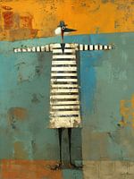 Vogel schilderij | Quirky Avian - Dit kunstwerk toont een gestileerde vogel in abstracte vorm, staande op twee poten, gekleed in een gestreept hemd en met een vrolijk uitziende blik, tegen een achtergrond van rijke, aardse tinten en abstracte vormen.