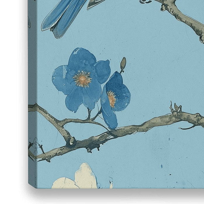 Twee blauwe vogels op een bloesemtak tak en een zacht blauwe achtergrond.