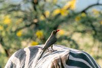 Tijdens onze safari in Zuid-Afrika kwamen we deze vogel tegen op de rug van een zebra. Het kleurencontrast met geel en groen op de achtergrond maakt het een mooie foto.