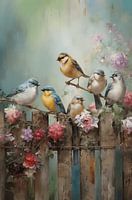 Elke vogel is met oog voor detail afgebeeld, van de levendige gele en blauwe mezen tot de lichtgrijze en crèmekleurige vogeltjes, elk met hun unieke verenkleed en expressieve blik. De bloesems voegen een vleugje romantiek en frisheid toe aan de compositie, en de houten schutting met zijn verweerde textuur biedt een solide basis en voegt diepte toe aan het tafereel. Dit kunstwerk straalt rust, vreugde en de schoonheid van de natuur uit, en is perfect voor iedereen die een vleugje lente en vogelgezang in huis wil halen.
