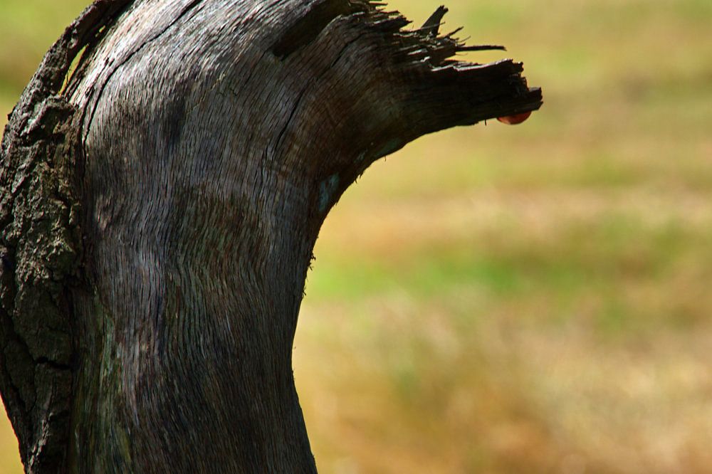 gebroken boomstam die eruit ziet als een vogelkop...