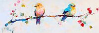 Twee betoverende vogels zitten op een delicate tak, omringd door delicate bloemen, hun levendige kleuren stralen in zachte pasteltinten. Hun zachte, nieuwsgierige blikken lijken een verhaal te vertellen, terwijl de lente met elke penseelstreek tot leven komt. Het spel van licht en schaduw geeft het tafereel een harmonieuze lichtheid.