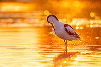 Tijdens de afgelopen warmste dag in juli tijdens de zonsondergang bijzondere sfeer en gouden kleuren op de weidevogelplas. De Kluut stond op de juiste plek om zich te poetsen in dit gouden licht.