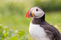 Papegaaiduiker ontmoeting in het groen - Farne eilanden. Prachtige fotogenieke en mooie zeevogels om te zien en fotograferen.