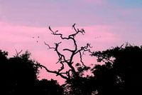 Deze prachtige silhouetfoto toont een boom vol rustende vogels tegen de betoverende achtergrond van een zonsondergang. Terwijl de zon langzaam onder de horizon verdwijnt, creëert het warme, gouden licht een serene en vredige sfeer. De vogels in de boom, met hun vleugels gespreid in het laatste licht van de dag, brengen een gevoel van kalmte en verbinding met de natuur over. Dit moment van stilte en harmonie tussen dier en omgeving maakt de foto perfect voor iedereen die de schoonheid van de natuur waardeert. Of je nu zoekt naar een rustgevend accent voor je interieur of een symbolische afbeelding van rust en balans, deze foto brengt een vleugje sereniteit in je huis.
