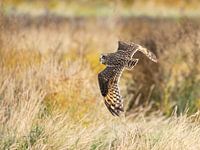 Velduilen echt nomaden die langs de Wadden en de Noordzeekust gedurende de herfst- en wintermaanden trekken en onze enige bij daglicht jagende uil. Een fascinerend gezicht om hem te zien 'vlinderen' door de lucht. Gemaakt in november met de nog aanwezige herfstkleuren op de schorren bij het Lauwersmeer-Moddergat.