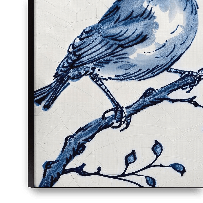 Dit is een afbeelding van een Delfts blauw keramiektegel met een traditioneel ontwerp. De tegel toont een fijn getekend tafereel van twee vogels die op een tak zitten, met bloemen en een vlinder die het plaatje completeren. De illustraties zijn uitgevoerd in klassieke blauwe tinten, kenmerkend voor Delfts aardewerk. Het ontwerp straalt…