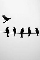 De afbeelding toont een gestileerde voorstelling van vogels op een hoogspanningslijn. Zes zwarte silhouetten zitten stil, terwijl een enkele vogel dynamisch opstijgt. De contrasten tussen de stilstaande en vliegende vogels creëren een spannende sfeer en symboliseren de overgang van kalmte naar vrijheid, een krachtige metafoor voor verandering.
