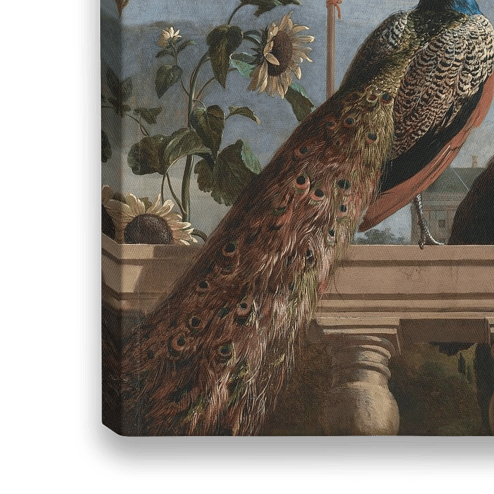 Vogels bij een balustrade met in de achtergrond het Stadhuis, Melchior d'Hondecoeter (1670)