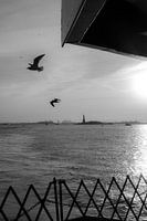 Prachtige zwart-witfoto van het Vrijheidsbeeld met perfect uitgelijnde vogels op de voorgrond. Genomen vanaf de veerboot naar Staten Island in 2023.