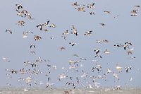 Bergeenden, pijlstaarten, scholeksters en meeuwen vliegen gezamenlijk op boven de Waddenzee.