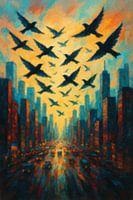 Dit moderne schilderij toont een grote zwerm vogels die hoog boven een drukke, kleurrijke metropool vliegt.