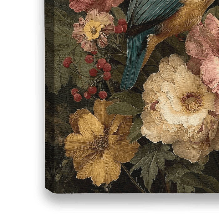 Deze digitale schildering mengt de majestueuze schoonheid van de ijsvogel met de weelderige kleuren van bloemen in een vintage stijl. Het zachte palet van warme tinten en de verfijnde textuur geven een dromerige sfeer aan het tafereel, waarbij de vogel bijna een symbool van vrijheid wordt te midden van de bloemen. Het werk is geïnspireerd door klassieke natuurbeelden, met een moderne draai door de gedetailleerde weergave van het dier en de flora.
