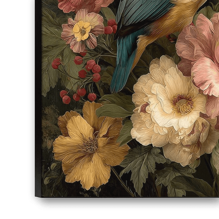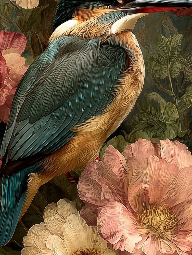 Deze digitale schildering mengt de majestueuze schoonheid van de ijsvogel met de weelderige kleuren van bloemen in een vintage stijl. Het zachte palet van warme tinten en de verfijnde textuur geven een dromerige sfeer aan het tafereel, waarbij de vogel bijna een symbool van vrijheid wordt te midden van de bloemen. Het werk is geïnspireerd door klassieke natuurbeelden, met een moderne draai door de gedetailleerde weergave van het dier en de flora.