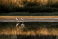 Deze sfeervolle natuurfoto toont twee jonge steltlopers die samen langs de waterkant wandelen, omringd door het warme gouden licht van de vroege ochtend of late namiddag. Hun reflecties in het kalme water zorgen voor een gevoel van balans en rust, terwijl de subtiele deeltjes in de lucht bijdragen aan de magische sfeer. Het beeld vangt een teder moment van samenzijn in de natuur, ideaal voor liefhebbers van serene fotografie met een oog voor detail en natuurlijk licht.