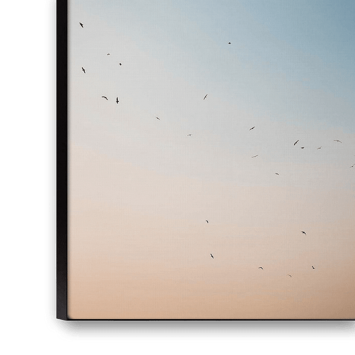 Een serene weergave van vogels die vrij door een uitgestrekt hemelgewelf zweven, waarin de kleuren subtiel verlopen van zacht perzikroze naar diepblauw. Deze minimalistische compositie vangt het gevoel van vrijheid en rust, terwijl de silhouetten van de vogels elegant over het rustige kleurverloop bewegen. Het werk straalt eenvoud uit, maar roept tegelijkertijd een diep gevoel van contemplatie op – perfect voor interieurs die verlangen naar ruimte, adem en natuurlijke harmonie.