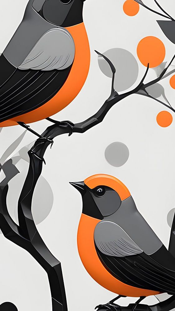 In dit kunstwerk zijn twee vogels te zien, zittend op takken die verweven zijn met abstracte vormen en patronen. De vogels hebben een opvallende combinatie van grijs en oranje tinten, die een levendig contrast creëren tegen de achtergrond van zachte, grijzige bladeren en takken. Het gebruik van geometrische vormen en minimalistische lijnen geeft dit werk een eigentijdse uitstraling.