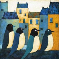 Een charmante afbeelding van vier gestileerde vogels tegen een achtergrond van kleurrijke stadsgebouwen. Het gebruik van sterke blauw- en okertinten creëert een speelse en surrealistische sfeer.