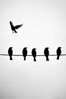 De afbeelding toont een groep van vijf zwarte vogels die in stille harmonie aan een touwtje zitten. Een andere vogel zweeft elegant in de lucht en creëert zo een dynamische spanning. Het monochrome contrast tussen de vogels en de lichtgekleurde achtergrond versterkt de zachte melancholie van de scène en trekt de blik van de kijker.