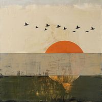 Dit indrukwekkende schilderij toont een groep vogels vliegend voor een gestileerde zon in warme oranje en beige tinten. Het contrast tussen de donkere silhouetten van de vogels en de zachte achtergrond geeft het schilderij een kalme maar dynamische sfeer. De ondergaande zon en de geometrische vormen voegen een moderne, abstracte toets…