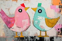Vogels kleuren | Vrolijke vogels - Op dit schilderij zie je twee vrolijke vogels, een roze en een turquoise, die elkaar aankijken met grote zwarte ogen, en het schilderij heeft een speelse, abstracte stijl met felle kleuren.