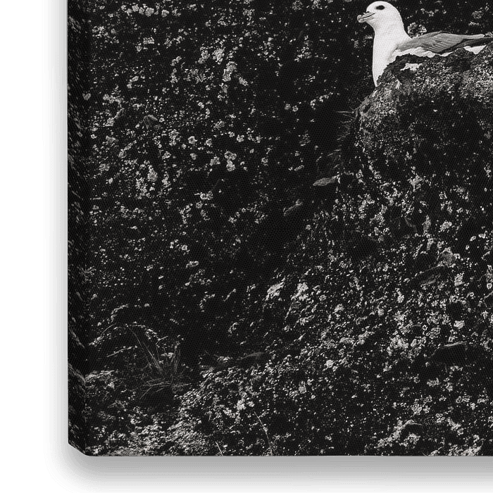 Deze sfeervolle foto toont drie zeevogels die rusten op een ruige rotswand, omringd door donkere tinten en subtiele begroeiing. Het contrast tussen de witte veren van de vogels en de textuur van de rotsen benadrukt de natuurlijke eenvoud en het harde leven in dit wilde landschap. Dit kunstwerk vangt een moment van stilte en harmonie in…