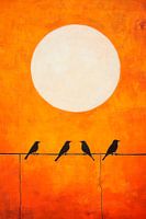 Een feloranje lucht, waarin een grote, stralende zon troont, vormt de perfecte achtergrond voor de vier gestileerde vogels op een eenvoudige draad. Deze harmonieuze compositie brengt warmte en vreugde in elke kamer. Ideaal voor de woonkamer, creëert het een uitnodigende sfeer die uitnodigt om te blijven hangen.