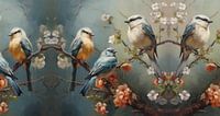 Leuke vogels op een tak lichte kleuren panorama schilderij met een prachtige stijl. Met prachtige kleurtinten en een uniek ontwerp maakt dit tot een stijlvolle fotoprint die prachtig staat in elke ruimte.