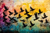 Dit levendige kunstwerk toont een zwerm silhouetvogels die over een prachtige, kleurrijke achtergrond vliegen. Met een mix van heldere kleuren zoals geel, blauw, roze en oranje, voegt dit schilderij energie en beweging toe aan elke ruimte. Het abstracte design gecombineerd met de street-art-stijl maakt dit een perfecte keuze voor moderne interieurs. Ideaal voor in een kantoor of slaapkamer om een speelse, dynamische sfeer te creëren.