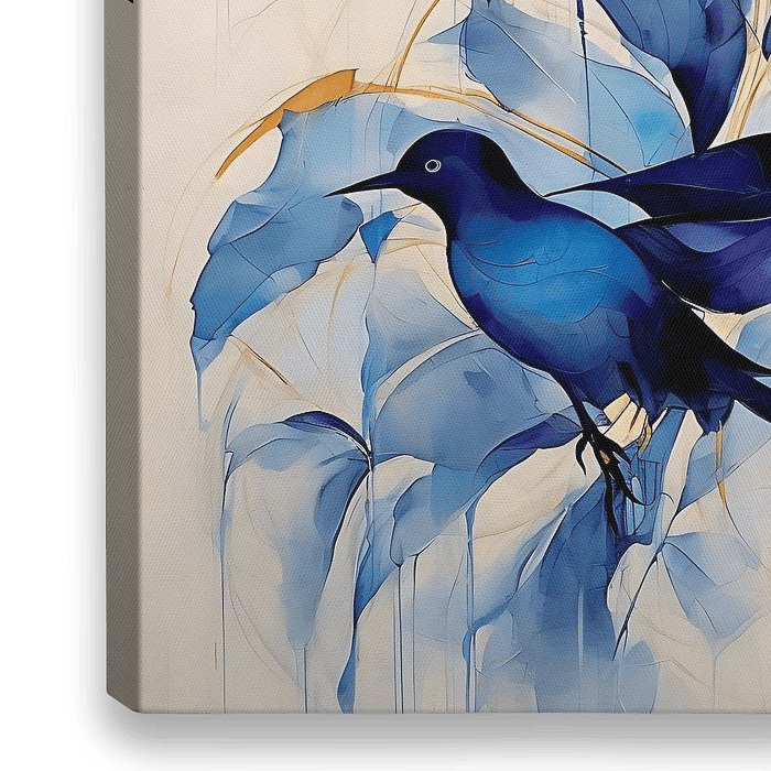Op het doek ontvouwt zich een betoverend schouwspel van blauwe pracht, een kunstzinnig eerbetoon aan de lucht en haar vleugelachtige bewoners. Verschillende vogels, gehuld in tinten azuur, turkoois en kobalt, met majestueuze gratie. Hun veren lijken geverfd met de lichtste hemelsblauwe nuances, en elk detail straalt een serene…