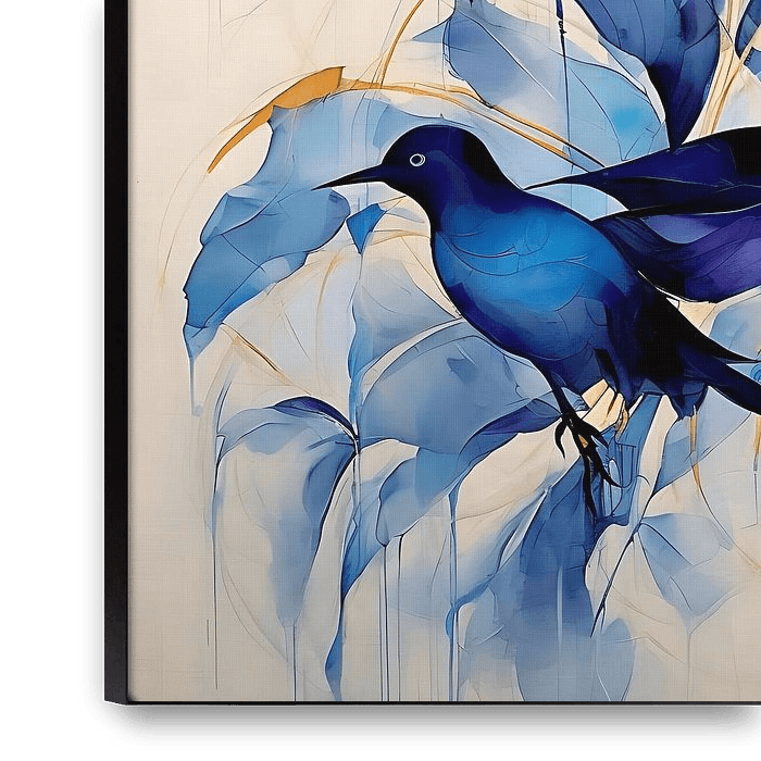 Op het doek ontvouwt zich een betoverend schouwspel van blauwe pracht, een kunstzinnig eerbetoon aan de lucht en haar vleugelachtige bewoners. Verschillende vogels, gehuld in tinten azuur, turkoois en kobalt, met majestueuze gratie. Hun veren lijken geverfd met de lichtste hemelsblauwe nuances, en elk detail straalt een serene…
