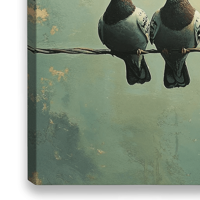 Deze artistieke en sfeervolle afbeelding toont vier duiven zittend op een elektriciteitsdraad met een enkele, warme gloeilamp die erboven hangt. De achtergrond heeft een vintage-achtige blauwgroene tint met een subtiele textuur, wat de afbeelding een klassieke, bijna schilderachtige uitstraling geeft. De warme gloed van de lamp…