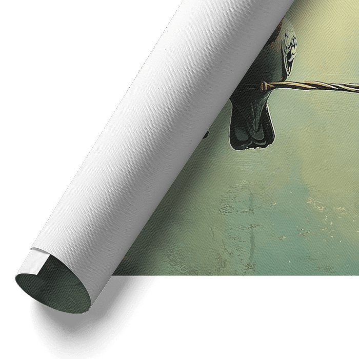 Deze artistieke en sfeervolle afbeelding toont vier duiven zittend op een elektriciteitsdraad met een enkele, warme gloeilamp die erboven hangt. De achtergrond heeft een vintage-achtige blauwgroene tint met een subtiele textuur, wat de afbeelding een klassieke, bijna schilderachtige uitstraling geeft. De warme gloed van de lamp…
