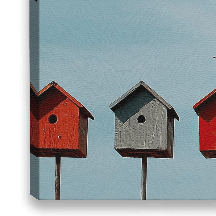 Op de foto is een rij van kleurrijke vogelhuisjes te zien. Ze staan hoog op palen en zijn strak naast elkaar geplaatst. De huisjes hebben een eenvoudige vorm met een driehoekig dak en een ronde opening. Twee vogels zitten bovenop, een feloranje en een donkere vogel. Op de achtergrond is een lucht met lichte wolken zichtbaar.