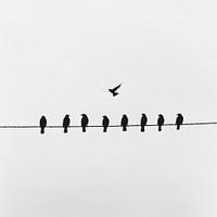 De foto toont een minimalistische scène met een rij vogels die op een hoogspanningslijn zitten. Opvallend is de duidelijke scheiding tussen de acht stilstaande vogels en de vogel die dynamisch wegvliegt. Deze contrasten in houding en beweging symboliseren misschien wel vrijheid en de drang naar verandering.