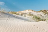Verse vogelsporen lopen over het zand tussen het helmgras door.